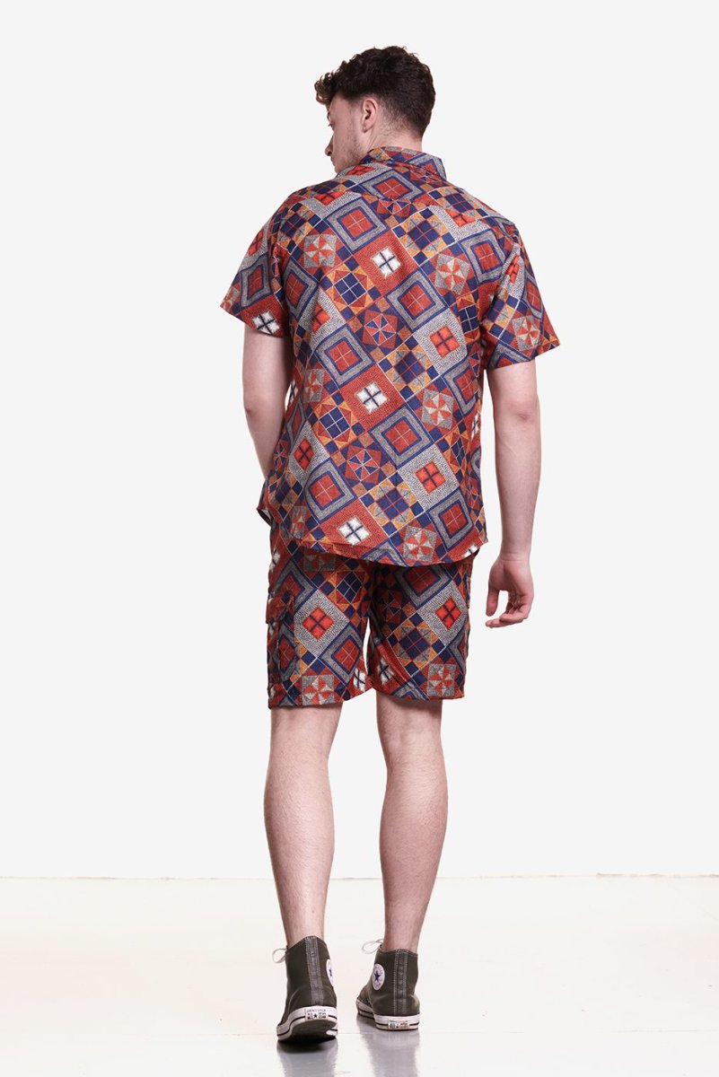 Bermudas de hombre con un original estampado geométrico de cuadros y rombos en color naranja, teja y azul marino.