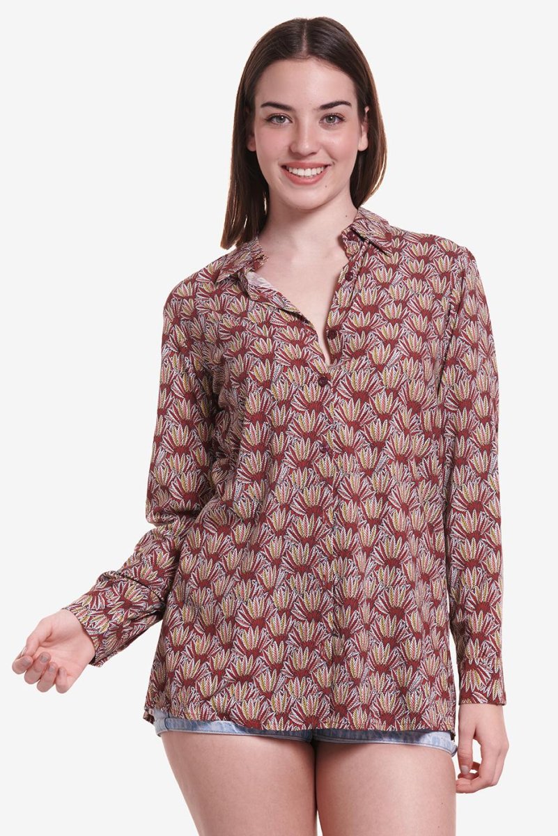 Camisa mujer en manga larga y con un original estampado en fondo color ladrillo y dibujos de abanicos con plumas.
