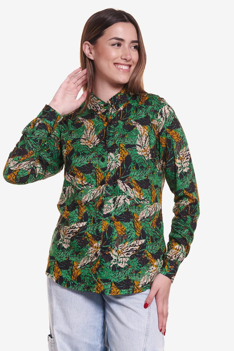 Camisa manga larga con estampado de hojas en color verde mostaza y piedra.