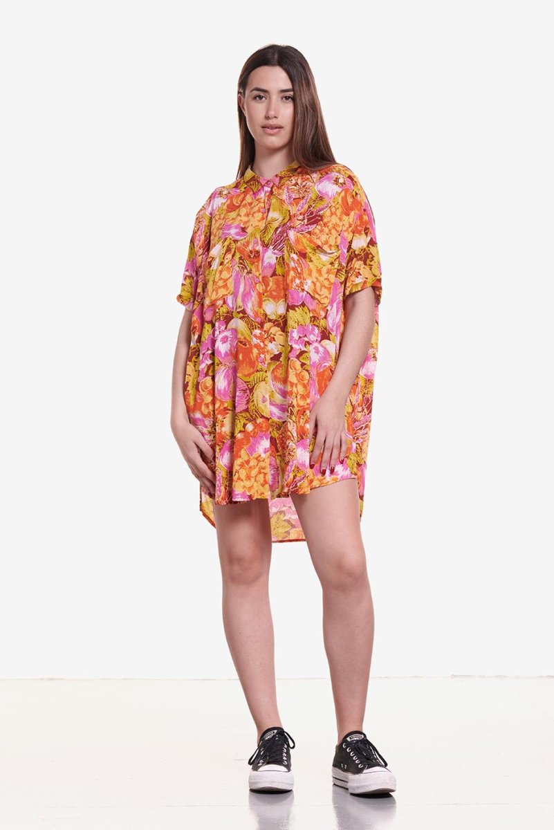 Vestido camisero con un alegre estampado en tonos amarillos, rosas y naranjas muy fresco y colorido.